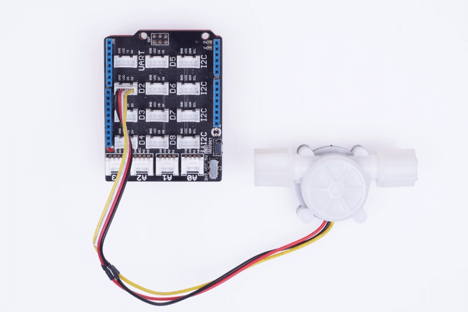 Arduino UNO 및 Seeeduino V4.2 와 같은 Atmega 328 기반 보드의 경우 . 인터럽트로 사용할 수 있는 두 개의 디지털 핀이 있습니다. 인터럽트 0 용 디지털 핀 2 , 인터럽트 1 용 디지털 핀 3 . 이 블로그에서는 D2 핀을 사용하여 유량 센서의 펄스 출력을 감지합니다. Seeeduino + Grove 베이스 실드 를 사용 하는 경우 물 흐름 센서를 D2 커넥터에 연결하기만 하면 됩니다. 다른 Arduino 보드를 사용하는 경우 점퍼 케이블을 사용하여 오른쪽 핀에 연결하십시오.