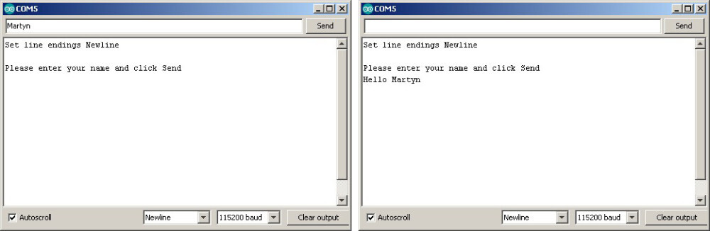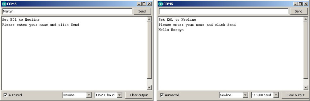 시리얼 모니터에서 "No line Ending"을 선택하고 새 이름을 입력합니다.
