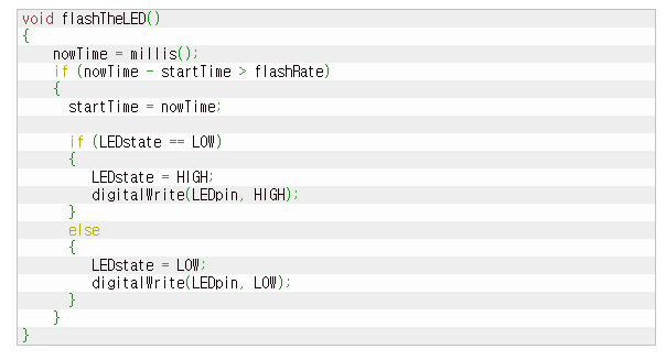 flashTheLED() 함수는 시간이 얼마나 지났는지 확인하고
