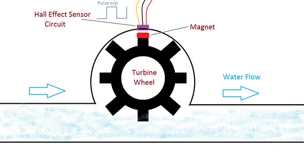 파이프 라인을 통해서 물이 흐르면 터빈 휠이 회전하고 마그네틱 홀 센서를 차단하게 됩니다