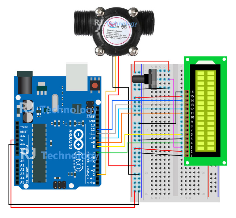 Arduino Uno 로 YF-S201 액체 유량센서를 사용해서 유량을 측정해 보고 1602 캐릭터 LCD에 측정값을 출력해 보는 프로젝트입니다 YF-S201 은 물과 같은 액체의 흐름을 측정하는데 적합한 유량센서 입니다