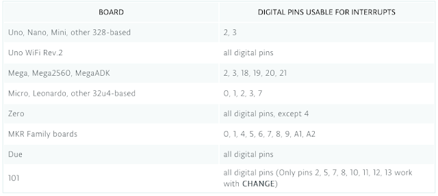 * 아두이노 우노/메가에서는 인터럽트 소스로 사용할 수 있는 핀이 몇개 안된다.