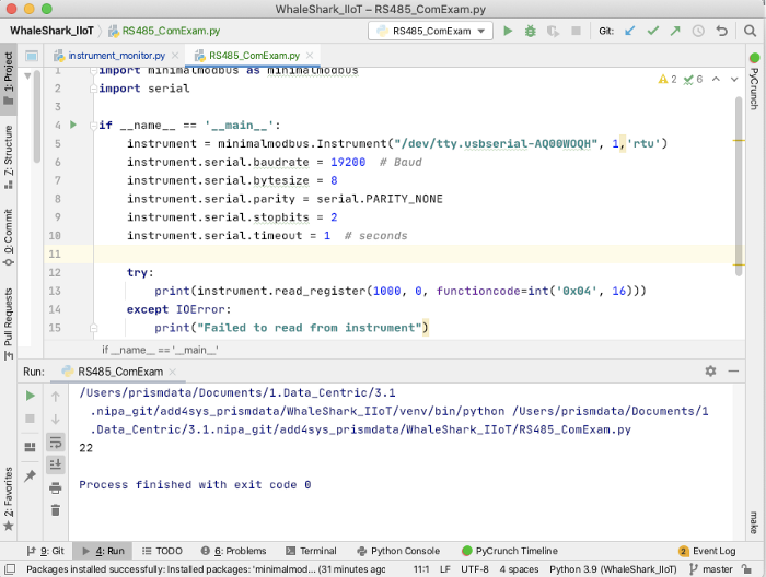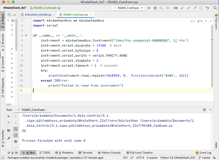 minimalmodbus.Instrument(“/dev/tty.usbserial-AQ00WOQH”, 1,’rtu’)에서