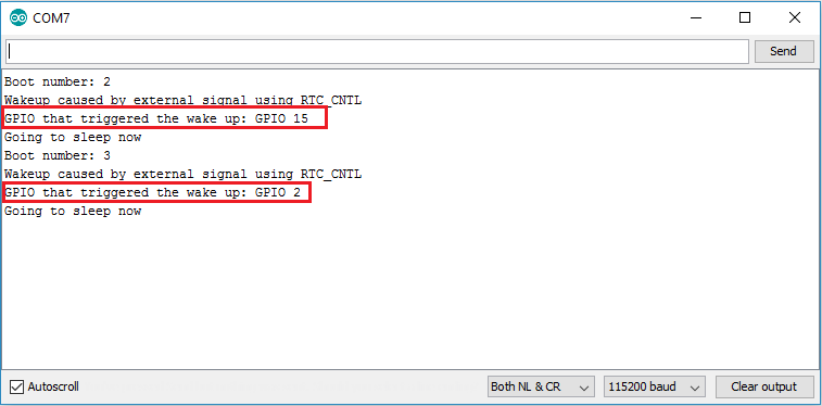 이제 다른 버튼을 사용하여 ESP32를 깨우고 어떤 버튼이 깨우기를 일으켰는지 식별할 수 있어야 합니다. 이 예에서 우리는GPIO 2 그리고 GPIO 15 깨우기 소스로.