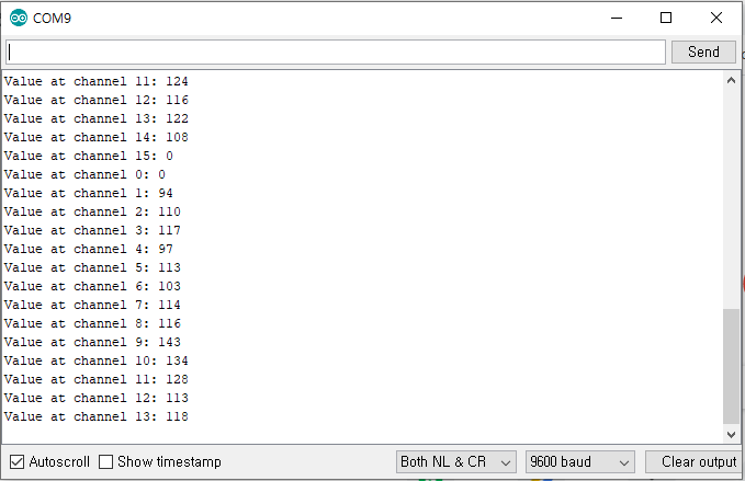 프로그램 업로드 후 시리얼모니터(Serial Monitor)를 실행하면 아래와 같이 channel 0부터 channel 15까지 연결된 센서의 데이터를 출력합니다. 프로그램에서 delay(1000)로 1초 간격으로 channel 값이 순차적으로 표시되는데 delay를 조절하면 더 짧은 간격으로도 표시 가능합니다.