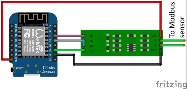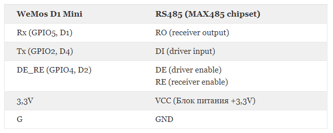 Wemos D1 mini가 있는 RS485 보드의 연결 다이어그램