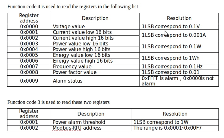 - 10개의 읽기 레지스터는 측정 (전압, 전류, 전력, 누적 전력, 주파수 및 역률) 에 해당하며