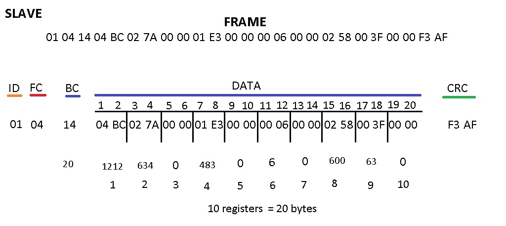 ////////// Reception Frame 10 Registers (Input Registers) Modbus RTU - RS485 ////////////////////////