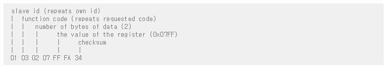 메시지가 슬레이브로 가는 도중에 손상되지 않았는지 확인하는 데 사용되는 체크섬도 포함됩니다.